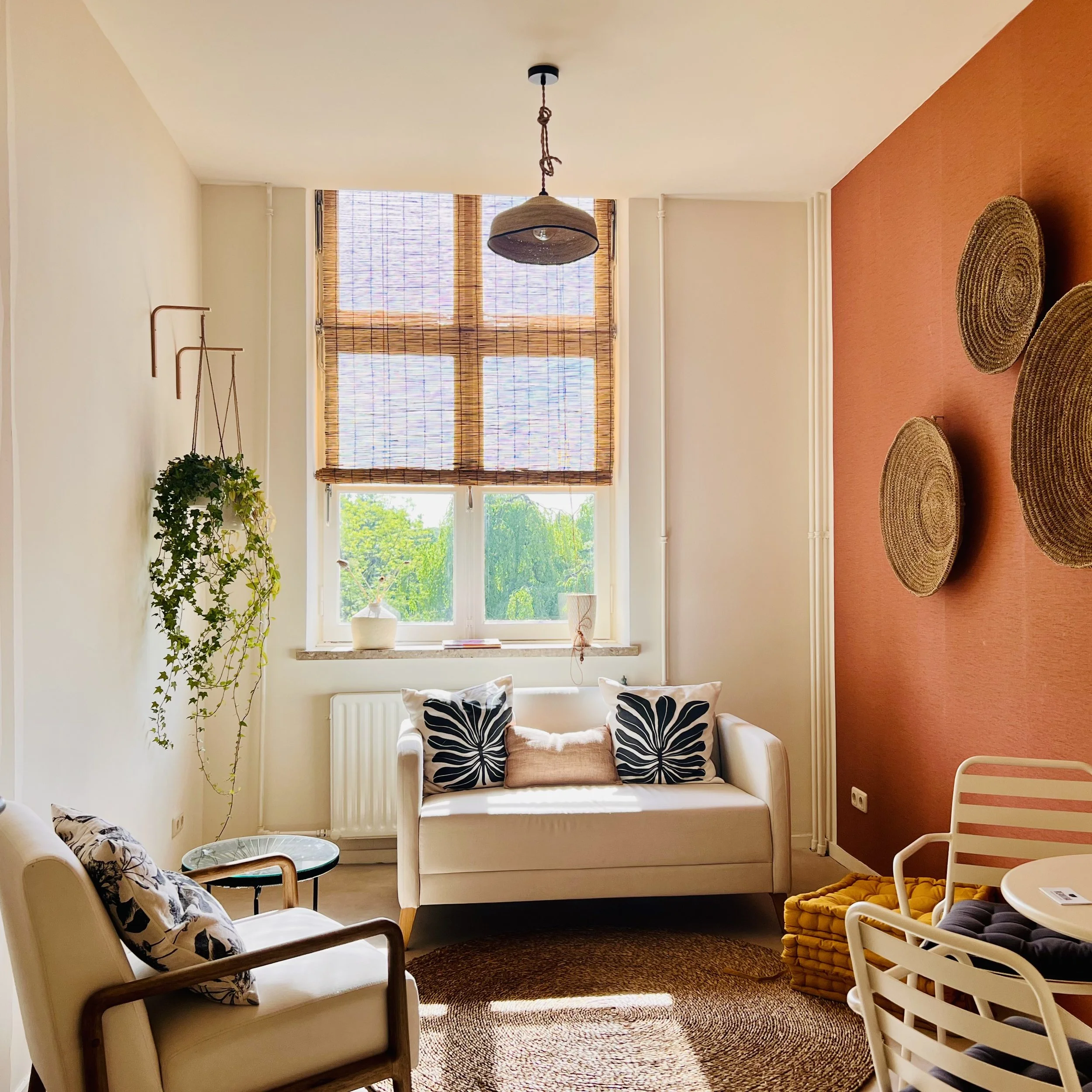De kamers en gemeenschappelijke ruimten combineren licht Scandinavisch design met zachte Bohemian accenten. Natuurlijke materialen, warme tinten en subtiele details zorgen voor een sfeer die kalmeert en omarmt.